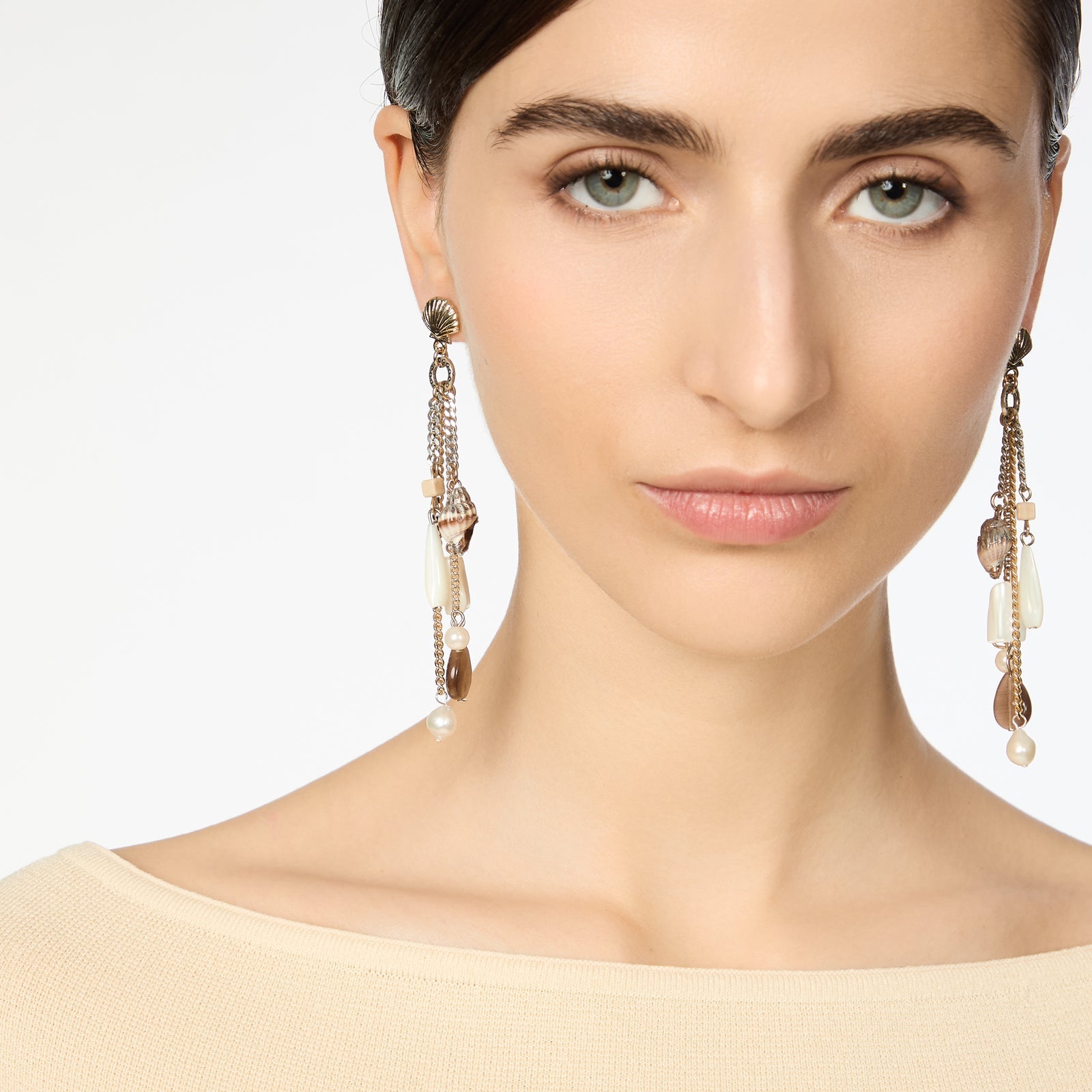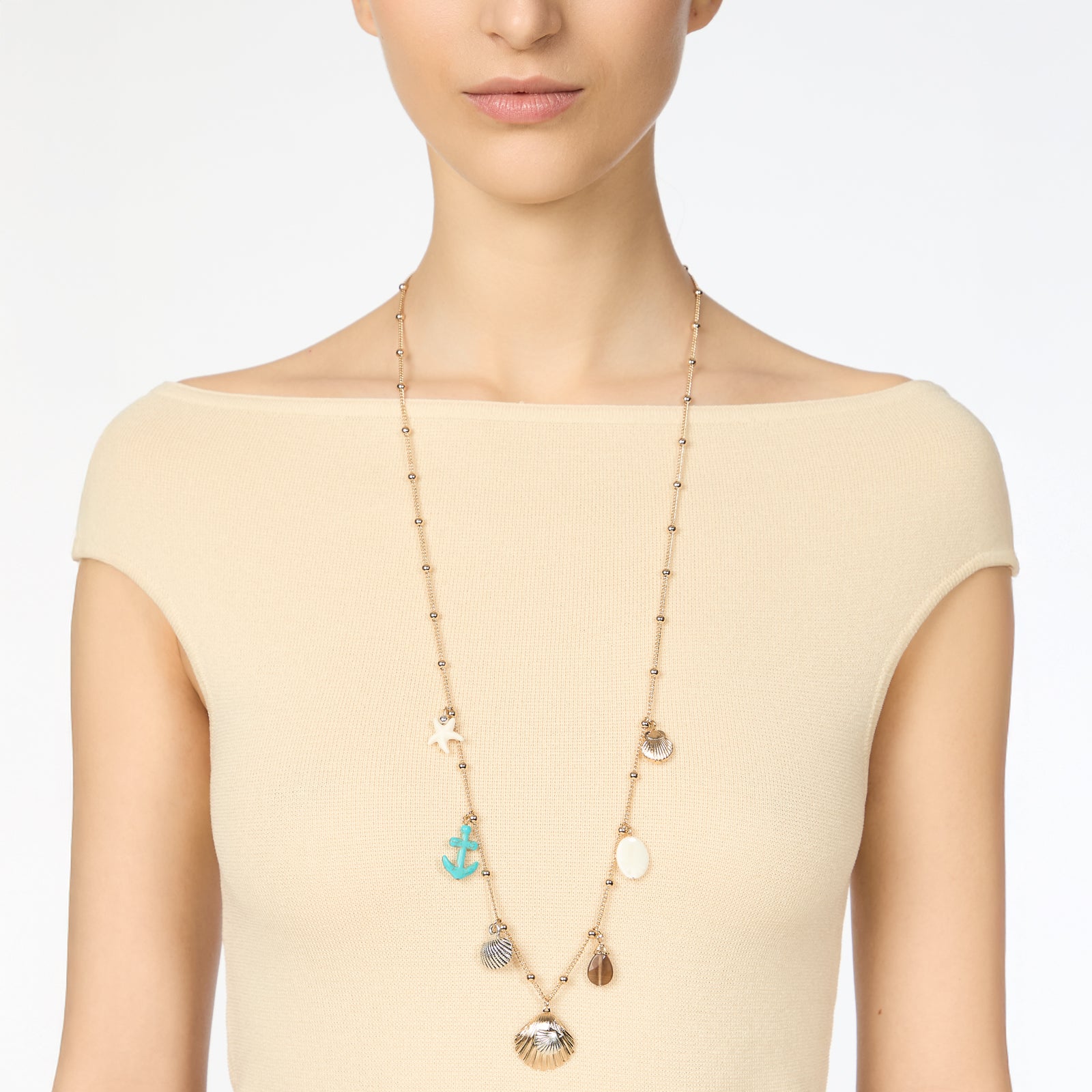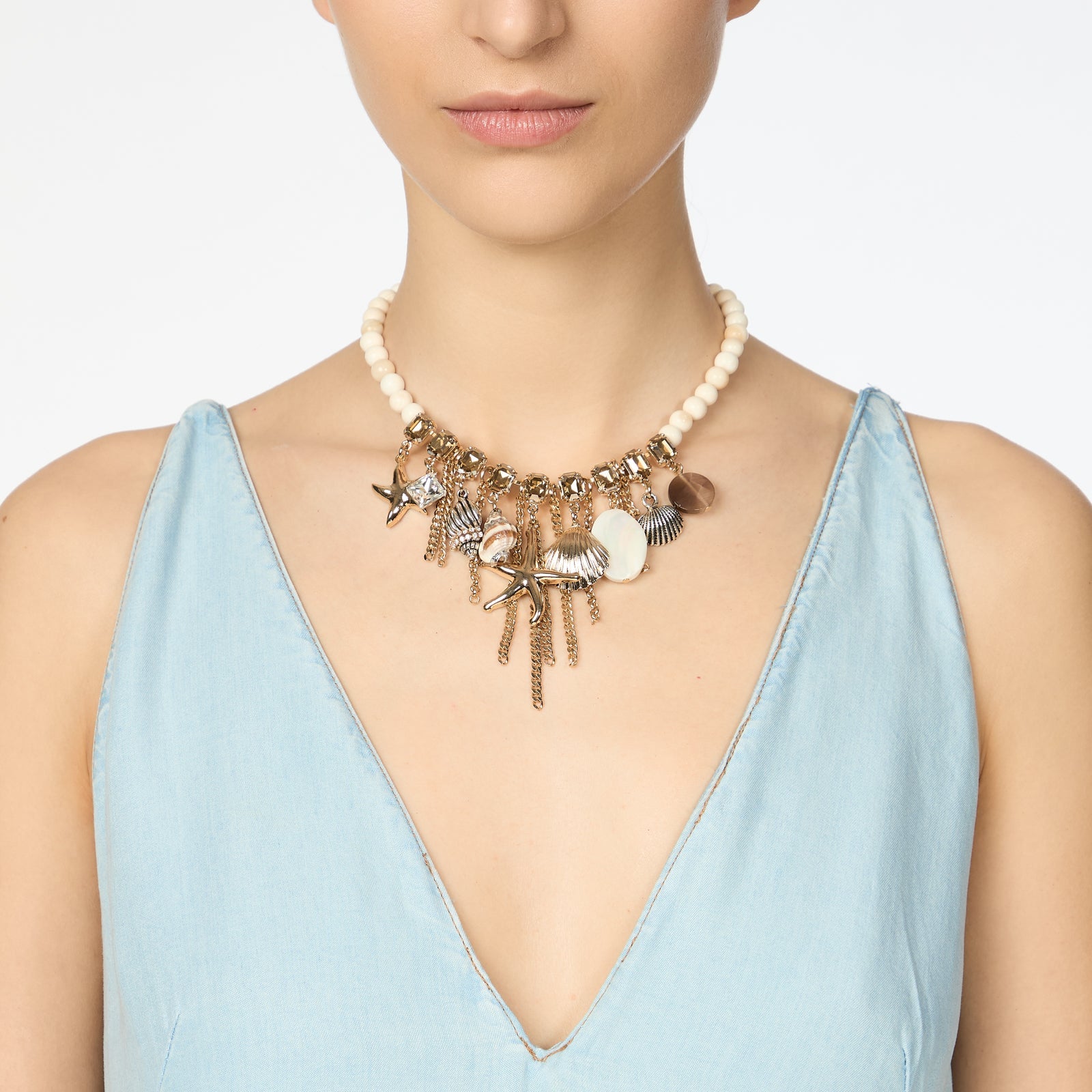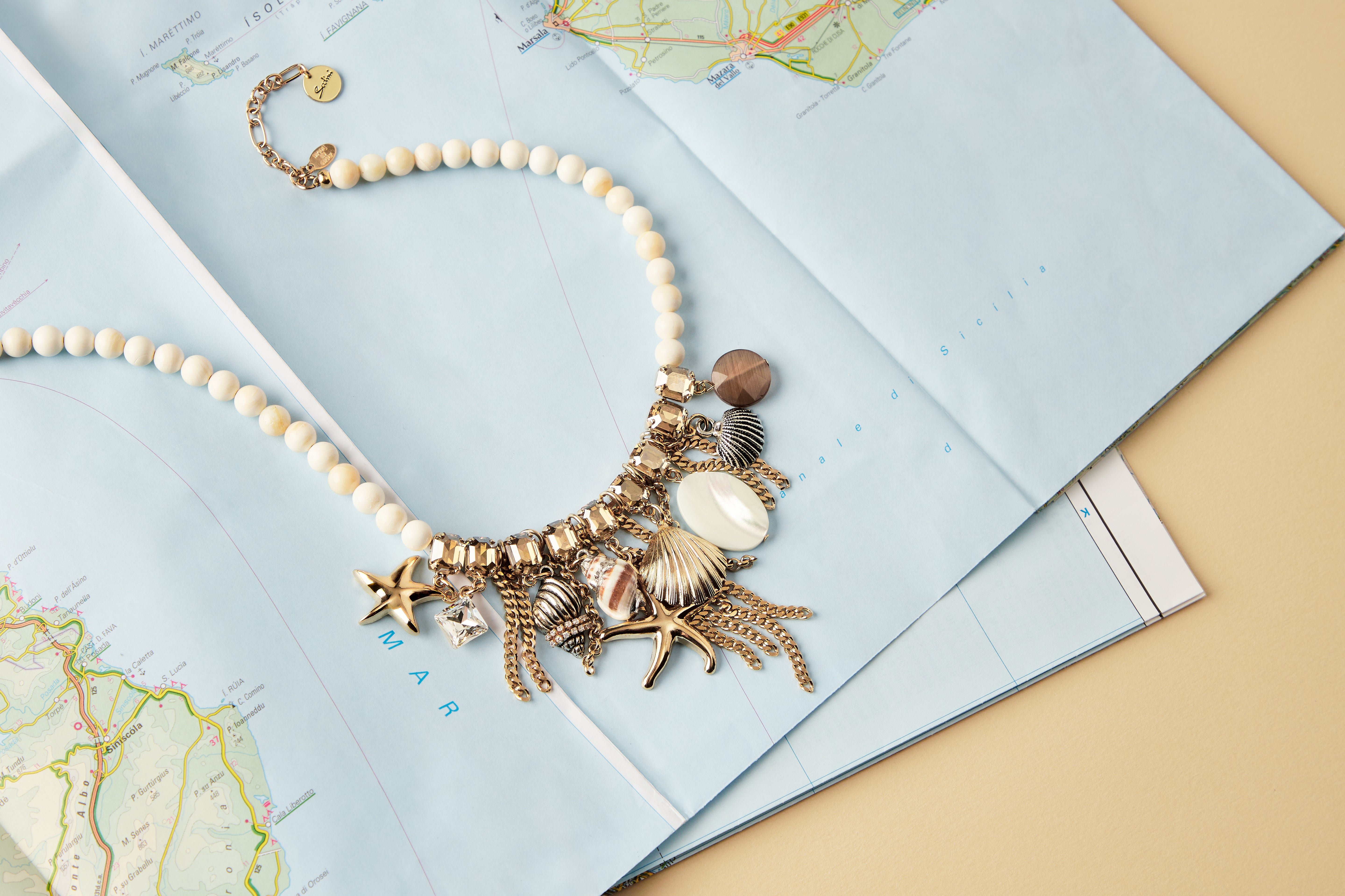 Maresia porta con sé la freschezza del mare d’estate. Stelle, conchiglie e altri elementi marini si intrecciano a madreperle e pietre naturali, dando vita a composizioni che evocano tutto il fascino segreto del fondale.