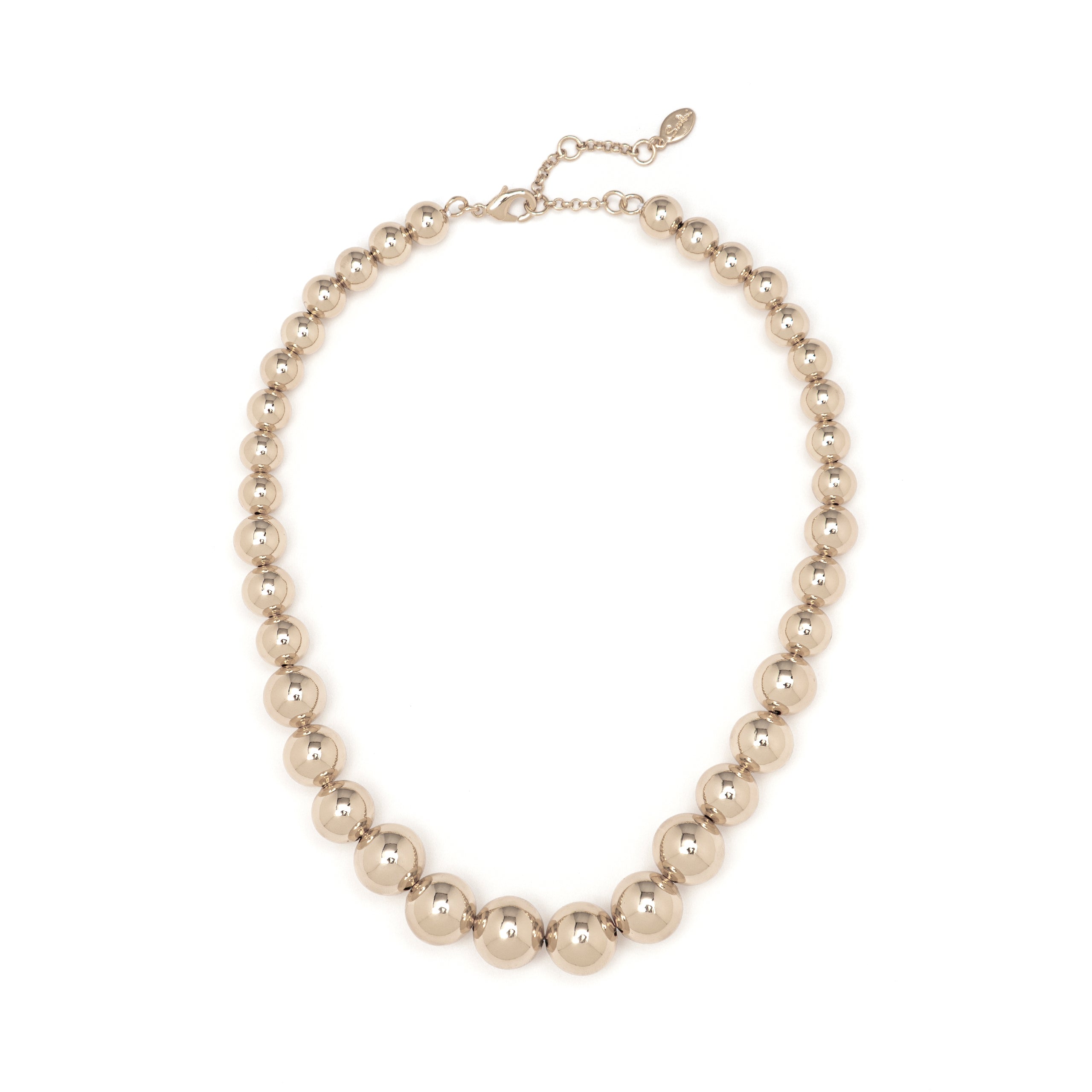 Lussuosa collana corta di gran moda che aggiunge un tocco fresco e seducente su qualsiasi mise. Il design presenta un filo di splendenti boule degradè che impreziosiscono il décolleté. Un accessorio perfetto in qualunque occasione, in una versione dalle luminose cromie dell'oro dalle nuances cioccolato. Targhetta Sodini sulla catenina di estensione.