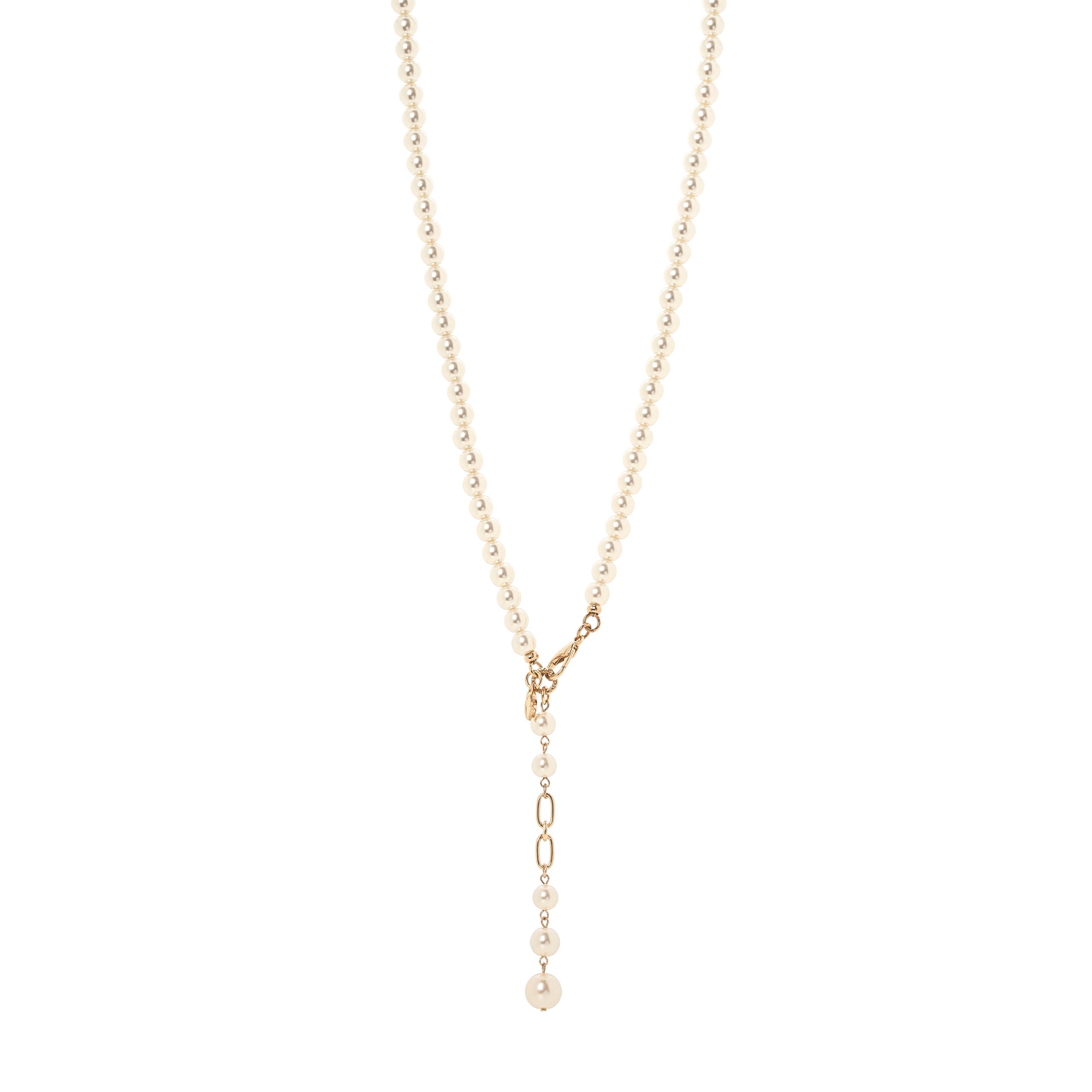 Spendida e affascinante collana lunga dal design di gran moda, con luminoso filo di candide perle che incontra la chiusura al centro dove cade un delicato pendente di perle incatenate. Un accessorio perfetto con qualsiasi outfit, nelle sue cromie del bianco e oro. Targhetta Sodini sulla chiusura.